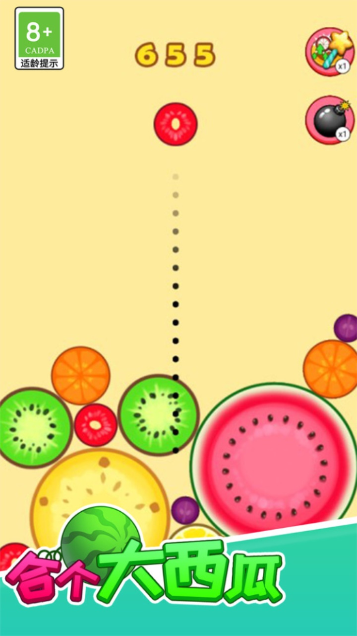 合个大西瓜游戏的两个西瓜不能放在一起。当屏幕上满是水果时,游戏结束。这是一个非常有趣和耗时的游戏。