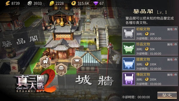 【文物鉴定】玩家可从NPC刘羽派遣出行系统获得文物,或是在兑换商店购买文物。当玩家等级到达40级,就可开启封地的新建筑「鉴品阁」。在鉴品阁内,可将获得未鉴定的文物鉴定成具有价值的文物,文物鉴定后会产生初级、珍品、国宝、传说四种品质。