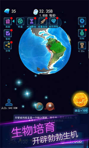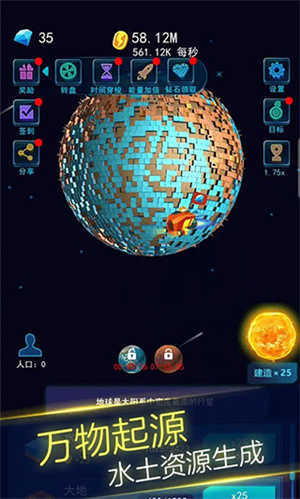 当我们进入游戏,映入眼帘的首先是一个光秃秃的地球,这便是它最初始的模样。在游戏的建造页面,我们能够消耗金币来创建水资源与大地资源,随着游戏进程推进,后续还会解锁诸如泥土之类的资源。