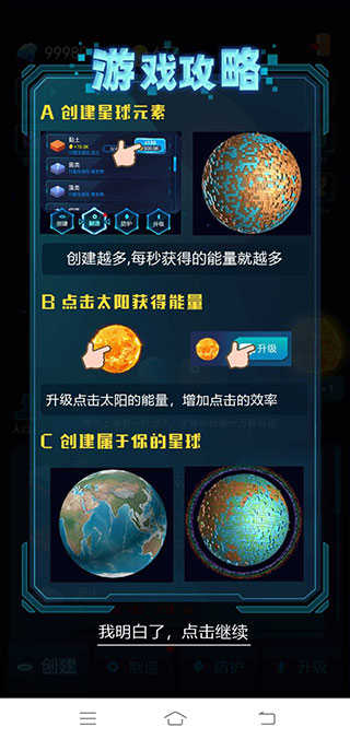 点开游戏的帮助界面,你会看到一些小提示。在这里,你能够创建星球元素,创建的数量越多,每秒获取的能量也就越多。此外,点击太阳也能获取能量,要是对点击太阳所获能量进行升级,还能提升点击效率。完成这些后,就可以打造属于你自己的星球啦。